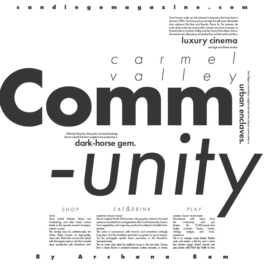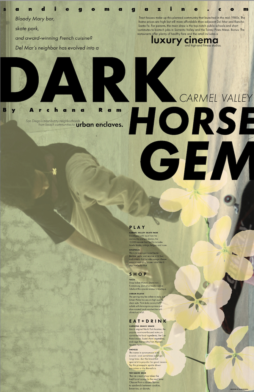 Carmel Valley is a San Diego neighborhood that has a suburban feel yet contains many new and modern hubs for dining, entertainment, and activities. I built an image library using my own photography and then experimented with typography, color, and layering. I wanted to capture the life and spirit of this suburban area through documenting its very own residents at the local skate park. The dynamic layout draws curious viewers in to learn more and want to come visit.