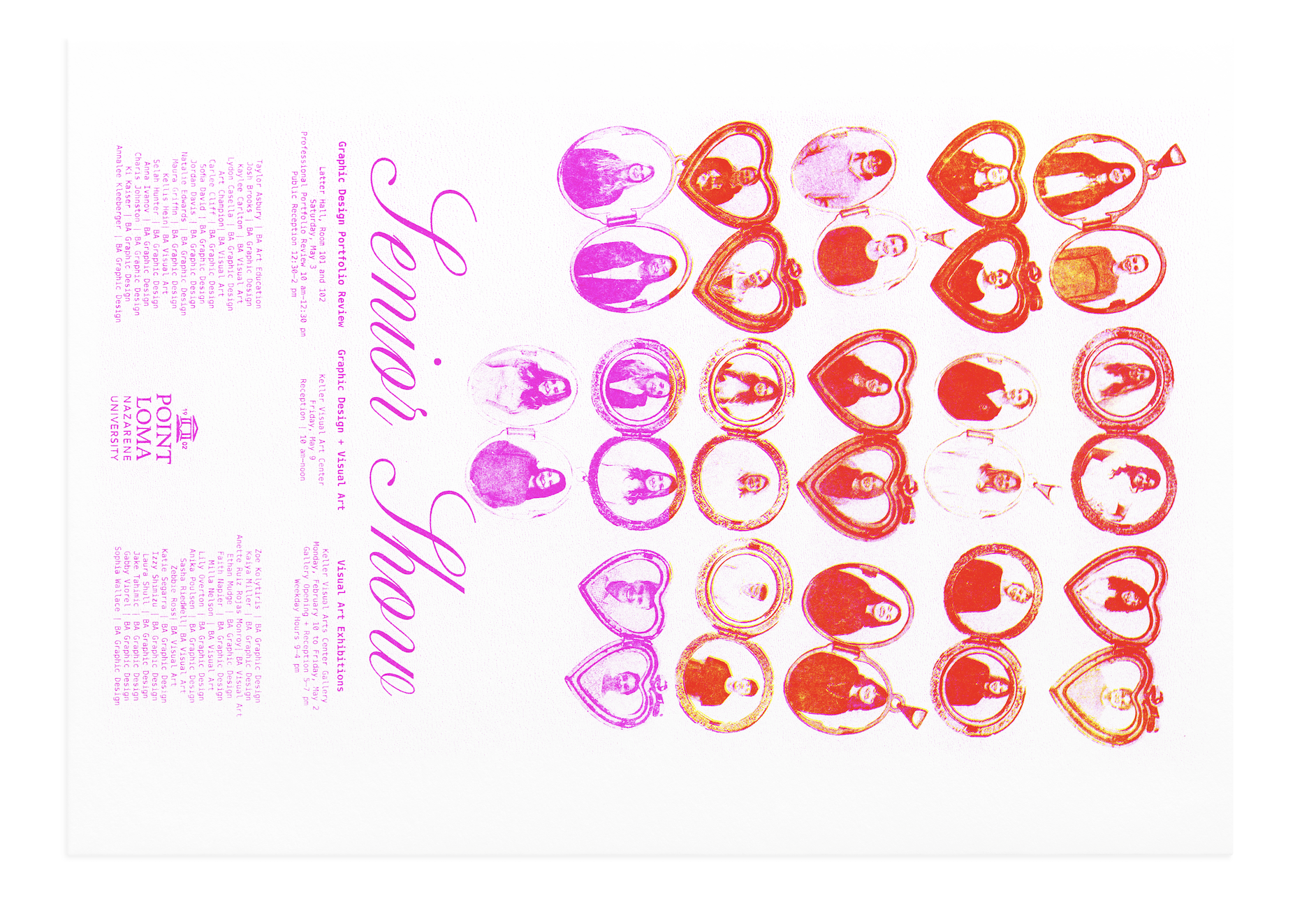 For the 2025 Senior Show event identity, I designed a poster to promote the Portfolio Review and Exhibitions for PLNU’s Art & Design Department. Every graphic design student submitted a design, with one selected for official event marketing. I photographed each senior and placed their portraits within charm locket graphics, symbolizing the uniqueness and collective “charm” of the graduating class. To enhance vibrancy and cohesion across media, I used a risograph printer, creating a bold and distinctive visual identity that celebrates the creativity of the senior class.